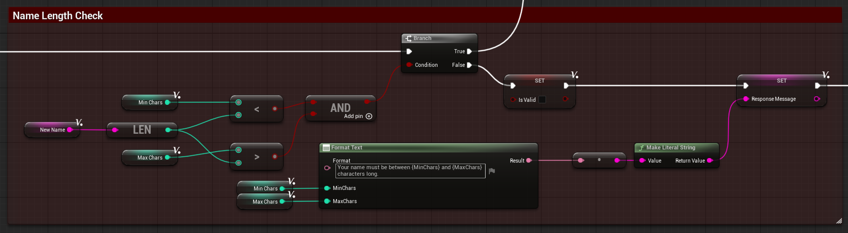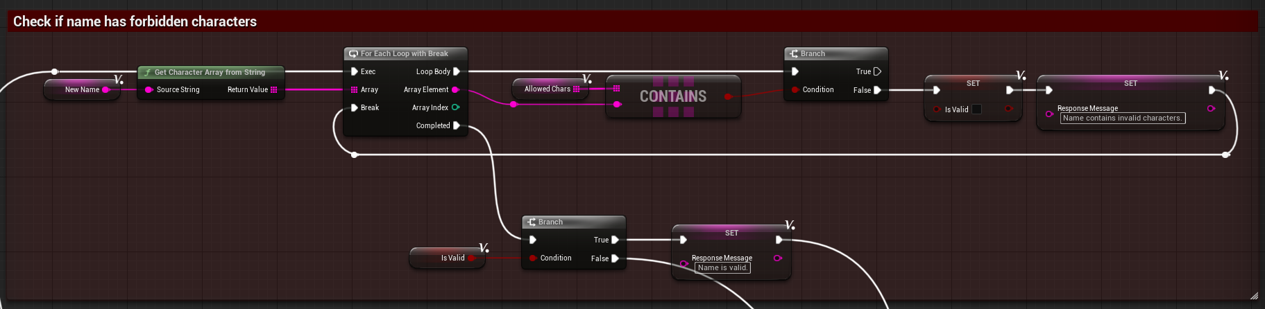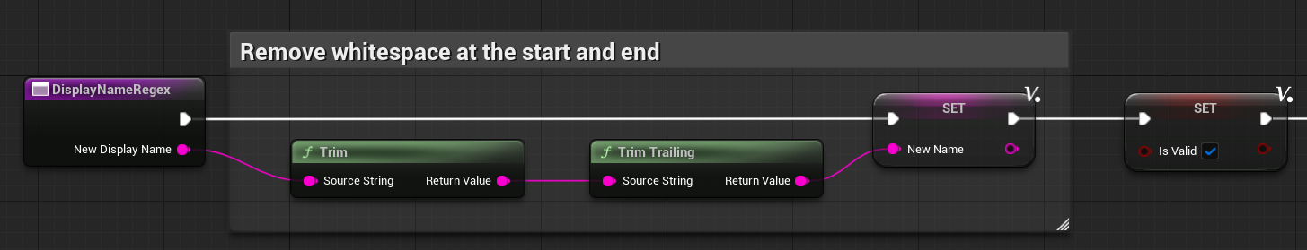We still wanted some way to control what names and, specifically, what characters are allowed. Unreal Engine has no predefined regex functionality, so I opted to write my own.