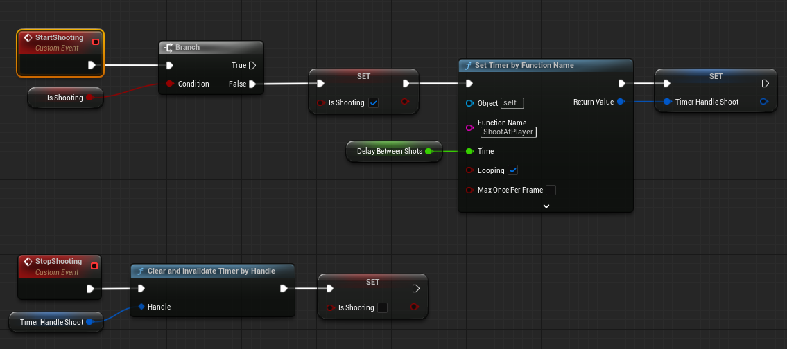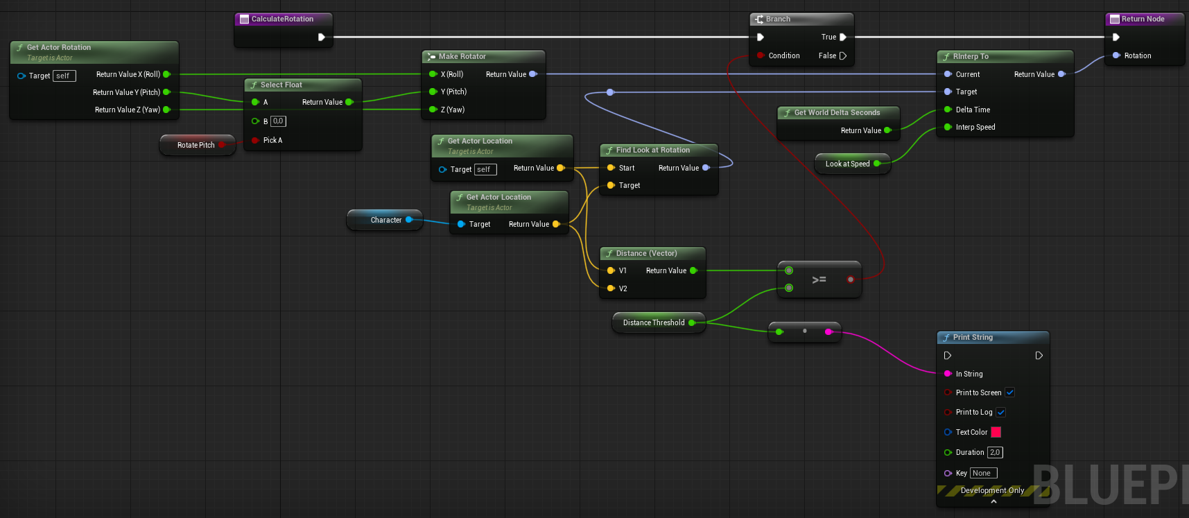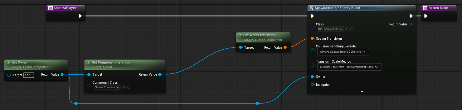 While it might look slightly messy, the logic is relatively simple. We retrieve the player's location and check whether it is below the distance threshold between the enemy and the player. If it is, we retrieve the enemy's rotation and the rotation the enemy would need to look at the player. Finally we interpolate between those values to smoothly rotate the enemy towards the player on the yaw axis. -
