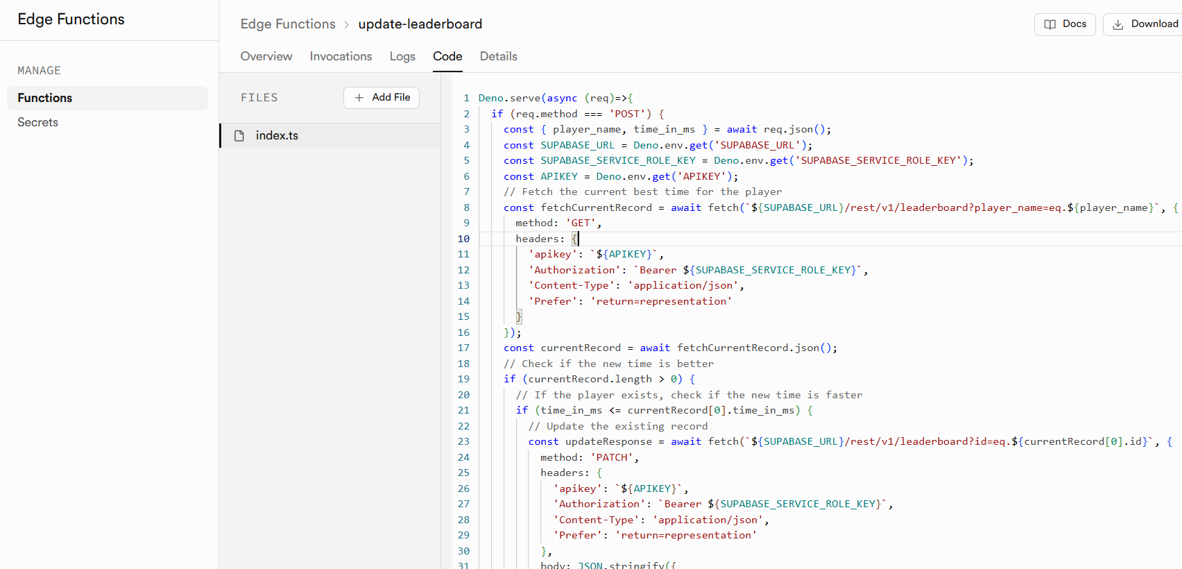 Due to time constraint (and knowledge) we did not have time to create a custom backend for storing and tracking run times. Instead we decided to use Supabase as our online leaderboard. We could communicate with Supabase through HTTP Requests, which we implemented in Blueprints using Epic's experimental plugin for HTTP Requests. To limit the possibilities of interacting with the leaderboard in unexpected ways, we left as much logic that changed values in the leaderboard to Supabase, and not in Blueprints. For example, players can submit their time to the online leaderboard, but they don't directly interact with the database, Supabase has functionality to handle user-sent data so that part is abstracted from the Blueprints logic. For example, the following function in Supabase receives a time from a player and updates the corresponding entry in the table if the time is faster than the existing time.